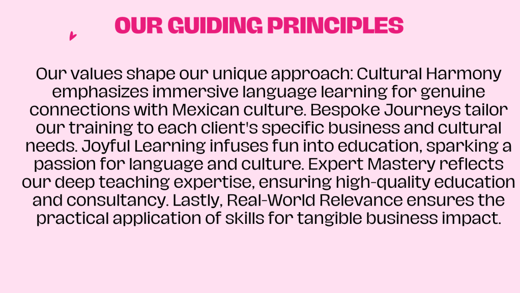 Embrace our Mexican Spanish training to unlock your team’s potential and propel your business forward in the global marketplace. This opportunity is your stepping stone to greater cultural fluency and market expansion. Choose growth, choose connection, choose success.